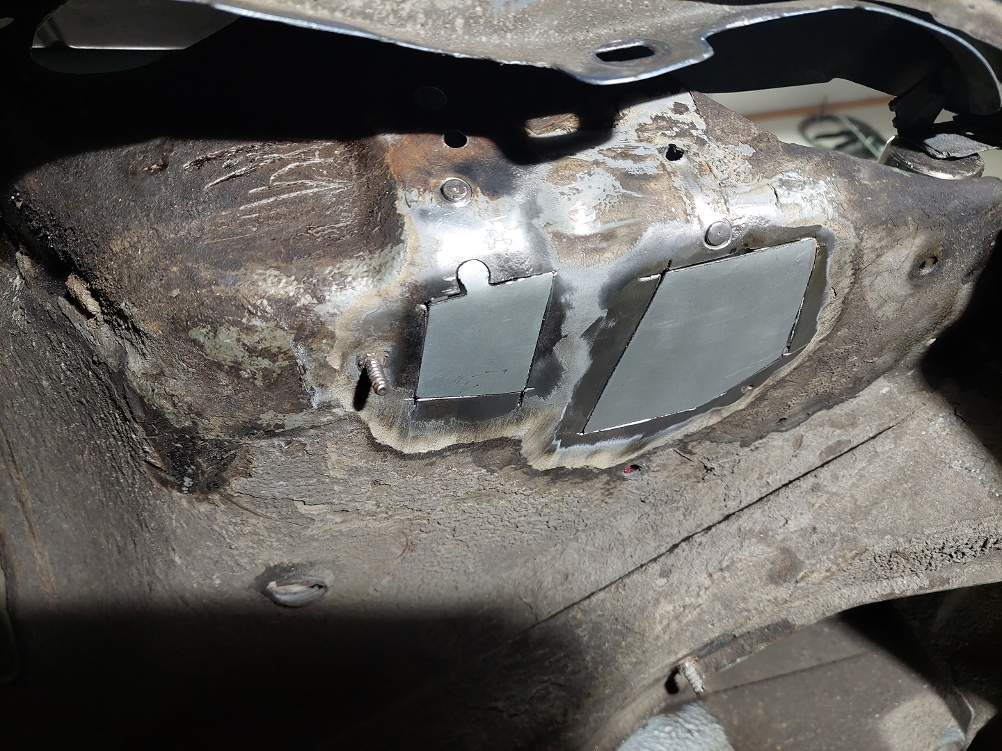 Etu-umpion takaa löytyi siis toinen reikä ja oli siinä lopulta toinenkin reikä. Otin puskurin kiinnikeraudan irti etulokasuojasta, koska sen kohdalla/alla oli sanomista. Pistehitsiporalla lähti nätisti. Aluksi mallailin yhtä isompaa korjauspalaa, mutta päädyin kuitenkin tekemään kaksi pienempää lappua. Tällä kertaa hitsasin kokonaan altapäin.
