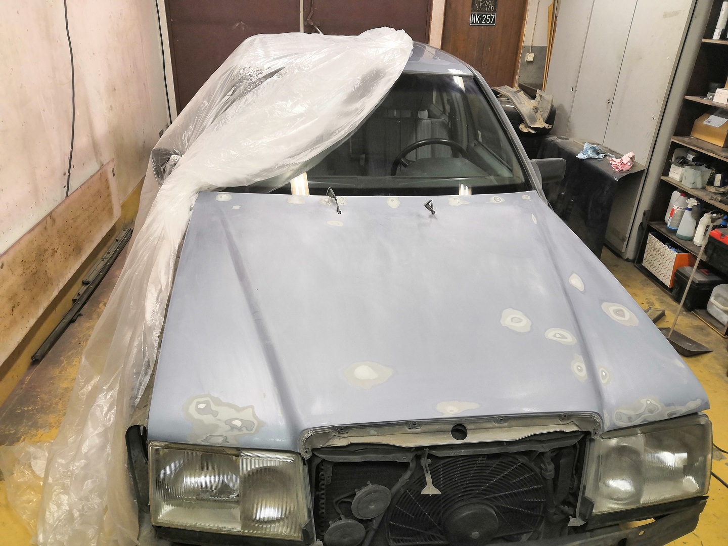 Pitää raahata auto tallille. Helmapellit on vielä maalaamatta ja maalaan ne itse. Oli tarkoitus hoitaa homma ennen maalausta, mutta en siihen kyennyt...