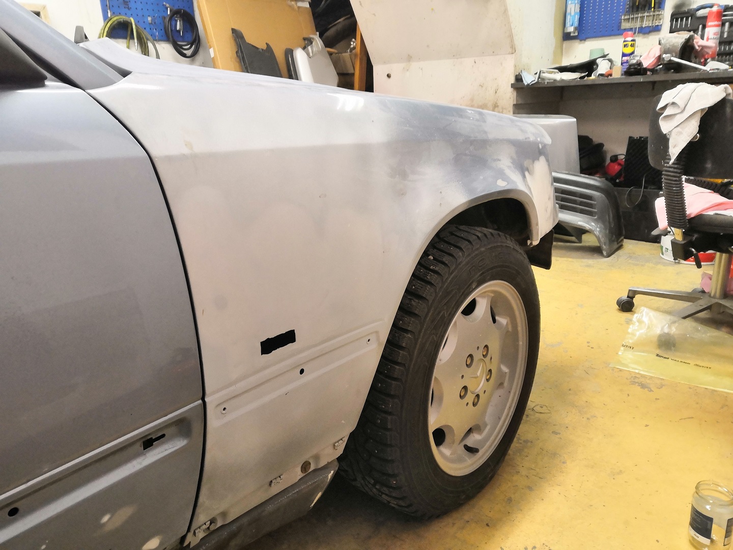 Koppa, lokasuojat ja takalunkka olisi pohjamaalattu. Takaovien oviaukot ja B-pilarien alaosat jo värissä.