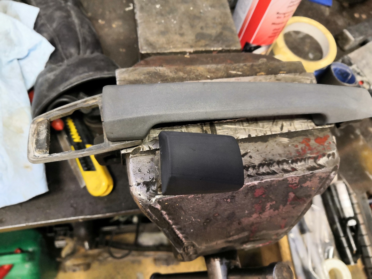 Kuskinpuolen ovista ja takaposkesta kävin myös muutamat ruvet läpi. Näitä en saanut kokonaan vielä matattua. Ovien alareunasta poistin listankiinnikkeet ja pesin niiden alta ilmestyneet liat. Putsasin myös kynnykset kuskin puolelta. Ovien välissä oli vielä pieni ruosterupi, joka katosi pölynä ilmaan. Laitetaanpa pari kuvaakin vaihteeksi...