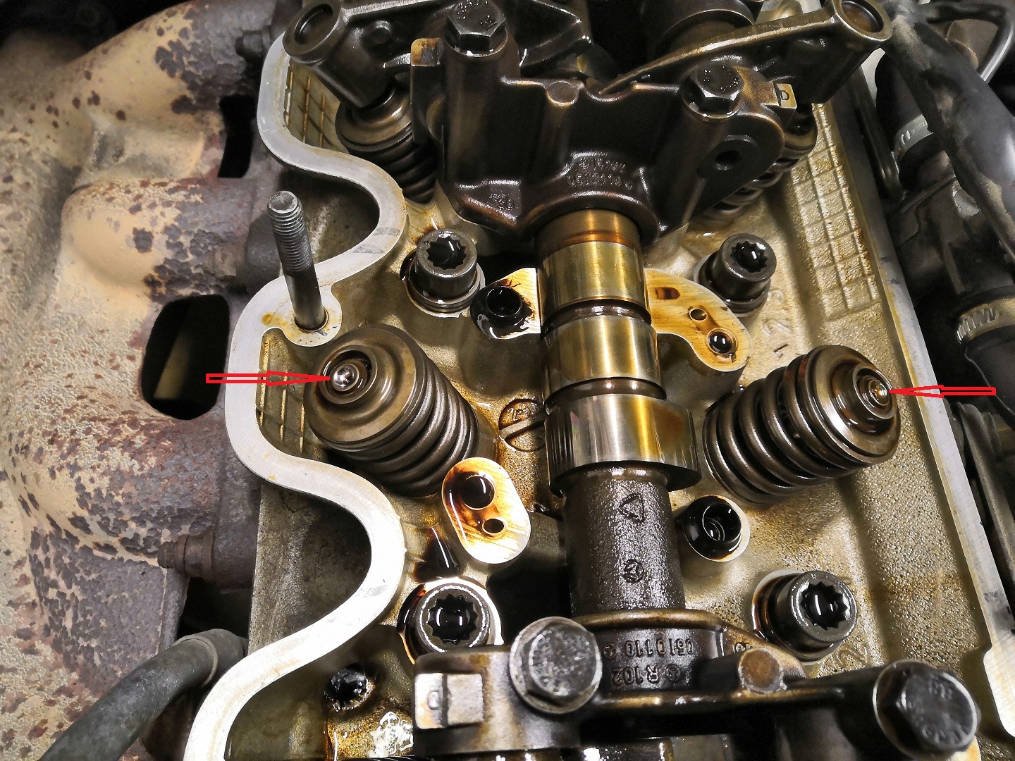 Ilmanputsarikotelo pois edestä ja sen jälkeen venttiilikoppa irti. Alta paljastuu nokka-akseli keinuvipuineen. Nostajat ovat keinuvipujen päässä. Aluksi pitää ottaa nokkia voiteleva öljyputki pois. Se on pitimillä kiinni 1. ja 4. laakeripukin pulttien alla, kuvassa nuolilla. Pyöritin nokan sellaiseen asentoon, ettei nokat painaneet noita vipuja ja irrotin öljyputken. Kiersin irrotetut pultit varulta takaisin paikolleen.