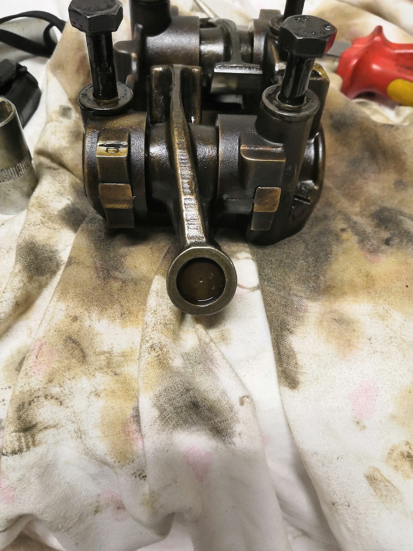 Sitten yksi laakeripukki kerrallaan koko keinuvipupaketti irti, nokka akseli tietysti aina sellaiseen asemaan ettei keinuvivut ovat vapaana. Konetta saa pyöritettyä 27mm hylsyllä kampiakselin pultista, vaihde vapaalla. Kannattaa varoa pudottamasta noita venttiilijousen päällä olevia "kuppeja". Nostajan nokka tulee noita kuppeja vasten ja saattavat takertua kiinni kun laakeripukkia nostaa pois.