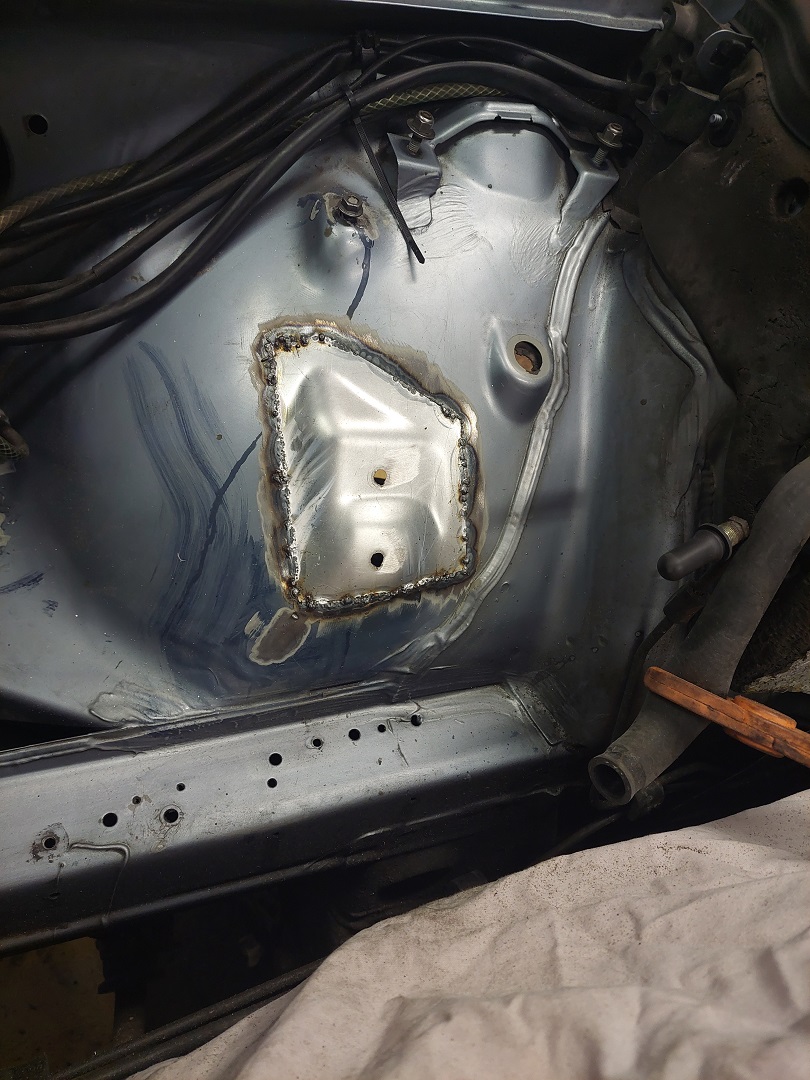 Otin vielä etu-umpion ja siirtelin sähköjohdot pois tieltä ja pääsinkin tutkimaan ja putsailemaan etukulmaa. Pintarupien lisäksi umpion kehyksen takaa löytyi vielä läpi asti ruostunut kohta. Kaivelin sitä auki ja rapsuttelin massat pois alapuolelta rupiselta alueelta. Tilasin trabhanilta tuon etukulman korjauspalana niin siitä saanee paikkalaput molempiin ilmestyneisiin reikiin. Hioin pintaruostepaikat puhtaaksi ja sivelin hieman fosforihappoa poistamaan ruosteet huokosista.
