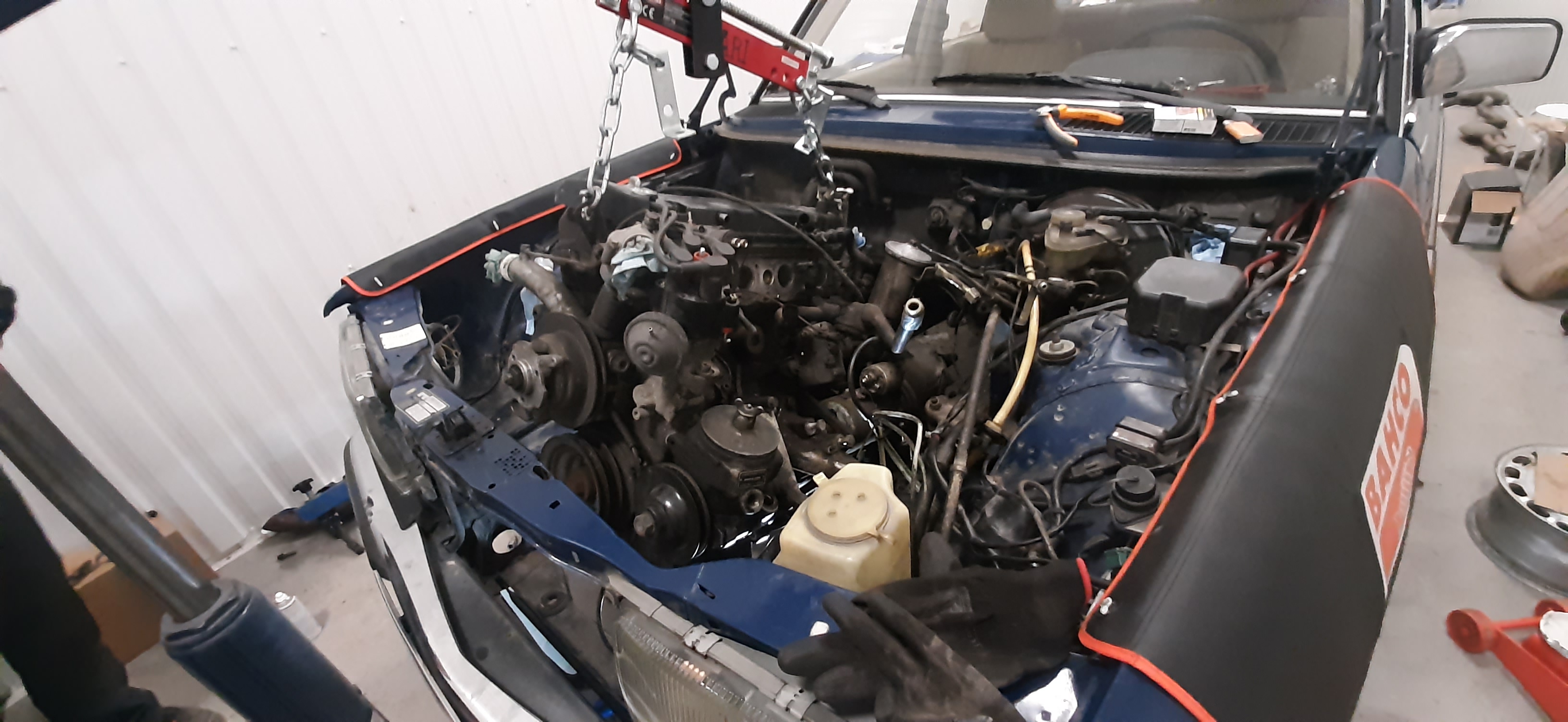 Tämän hetkinen tilanne on se autoa aika paljon purettu ja moottori otettiin ensimäiseksi kohteeksi. Kansiremontti on tehty ja Lohko on maalattu. Myös uudet tiivisteet ja pultit on ostettu. Varsinainen haaste oli löytää uudet männänrenkaat jotka onneksi lopulta löytyivät. Myös kampiakselin runkolaakerit ja kiertokangen laakerit menivät uusiksi. Seuraavaksi vielä uudet jakopään osat ja moottoria voidaan alkaa kasaamaan. Seuraavat kohteet ovat ruiskutusjärjestelmän korjaus ja sisustanosien etsiminen tai kunnostaminen