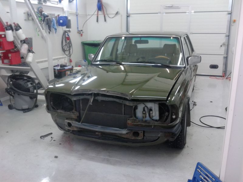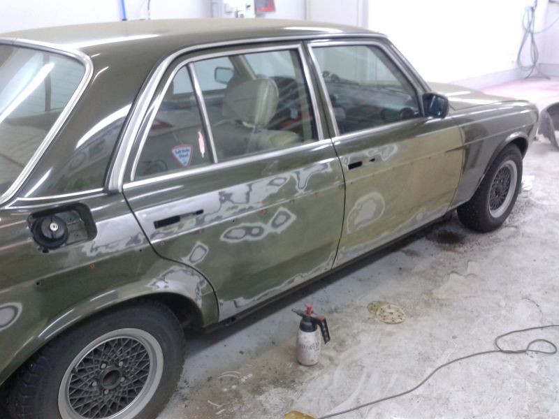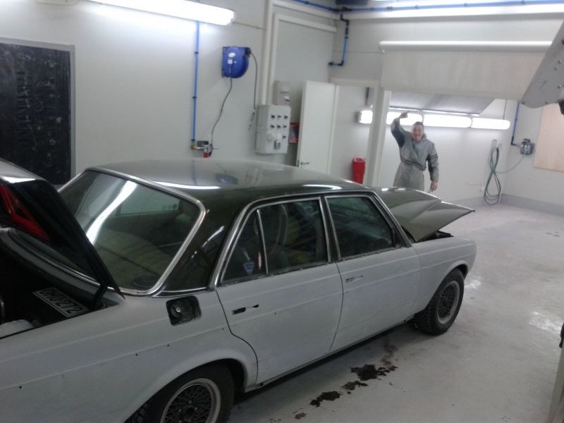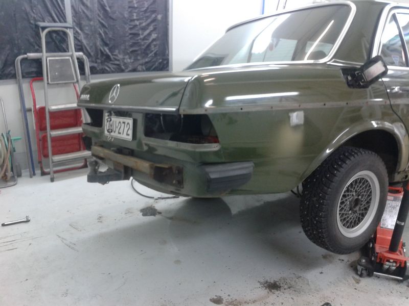 Sinne jäi mersu, kaverin hallille kuivumaan. Huomenna pääsee tutkaileen lopputulosta oikein tosissaan. Mutta tosi hyvältä kyllä nyt näytti ja eipähän enää ole niitä #¤x!*leen ruoste pisteitä 8)
