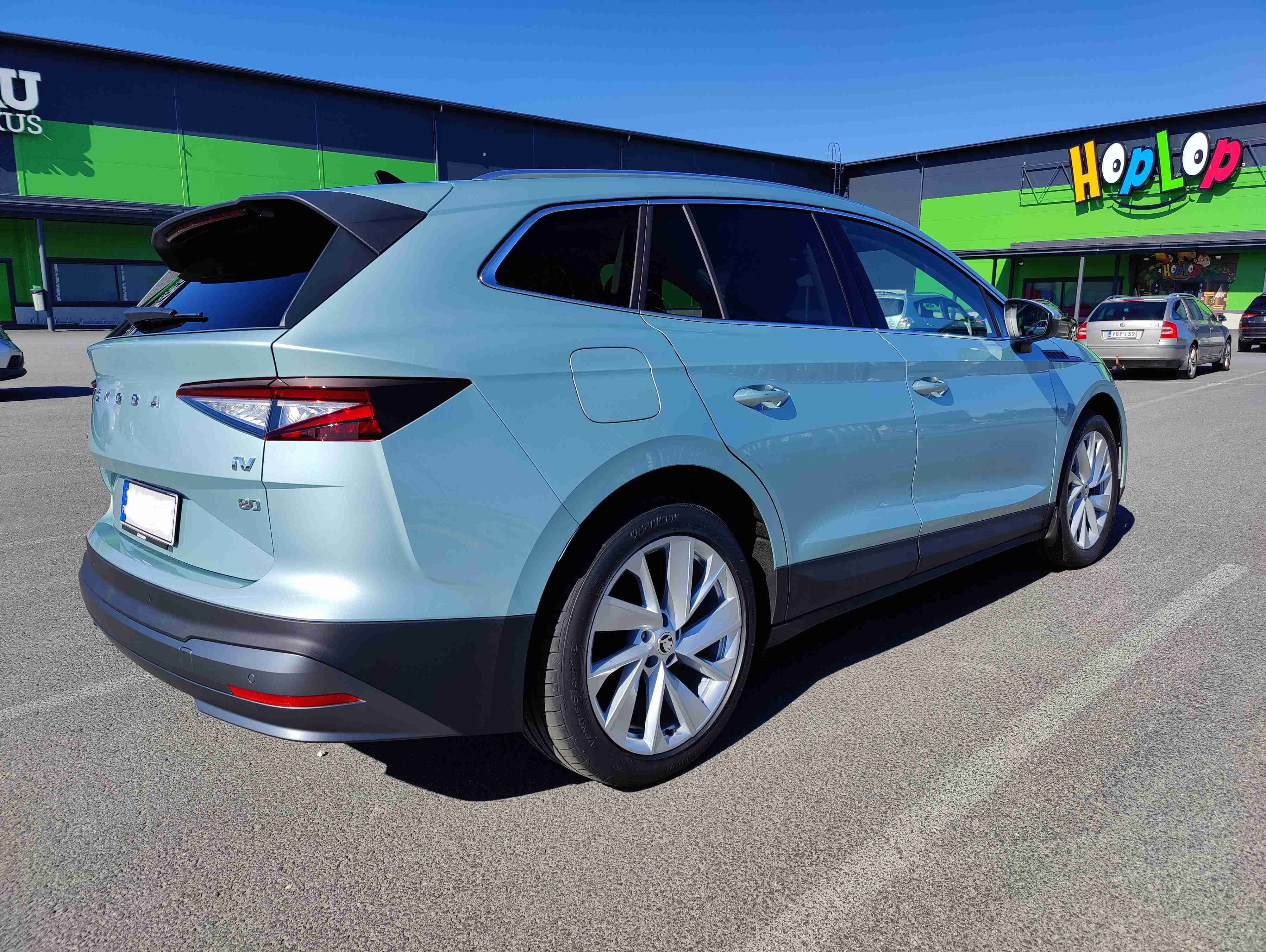No kooltaan tämä on tosiaan samaa kaliiberia Kodiaqin kanssa. Jos katsoo pelkkää auton pituutta numeroiden valossa, se ei kerroa kaikkea, koska sähkövatkaimen nokka on lyhyempi kuin polttomoottoriautoissa. Sisätiloiltaan tuossa on verraten hyvät tilat.
