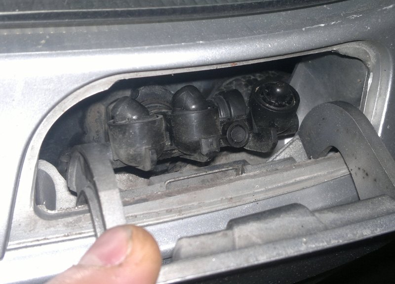 Pitää repiä koko hemmetin pesurisysteemi pöydälle ja oikein ihmetellä....eli näyttäis että tuolla alla on pari pulttia jolla paketti vedetty puskuria vasten, mutta samalla pitää ilmeisesti se muovimutteri kuitenkin irrottaa "jortikan" juuresta